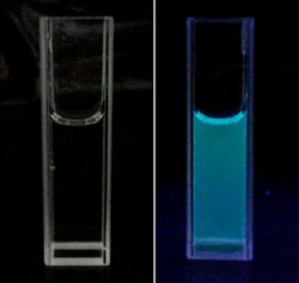 Emission Photos (1) of ACS Material Carboxylated Graphene Quantum Dots Excited by Natural Light (left) and UV Light (right)