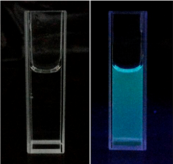 Emission Photos (1) of ACS Material Carboxylated Graphene Quantum Dots Excited by Natural Light (left) and UV Light (right)