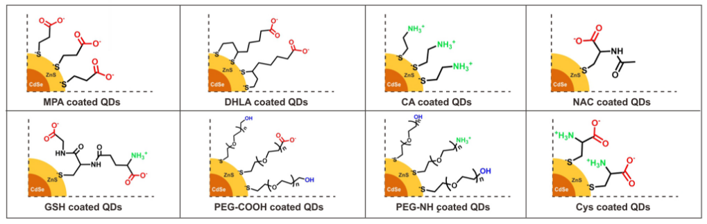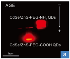 材料:ZnSe/ZnS, InP/ZnS, CdS/ZnS, CdSe/ZnS, 808nm/980nm激发上转换发光纳米粒子,近红外PbS,Ag2S量子点 表面配体: (1) 小分子类:3-巯基丙酸(MPA)\L-半胱氨酸(Cys)、N-乙酰-L-半胱氨酸(NAC)、谷胱甘肽(GSH)、二氢硫辛酸(DHLA)、巯基乙胺(CA)等; (2) PEG类:可进行羧基或氨基修饰,无非特异性吸附,PH适用范围广; (3) 两亲性高分子 应用:生物分子、细胞、组织、药物作用等多色标记成像 |