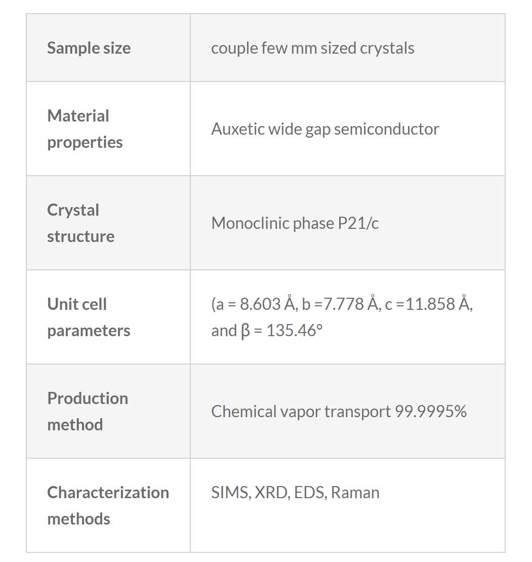 GaPS4 is a 2D auxetic material with exotic mechanical and optical properties. In 2D form, it exhibits negative Poisson’s ratio both in-plane and out-of-plane directions. Bulk GaPS4 is a direct wide gap semiconductor with the computed band gap values of 2.1 and 3.2 eV depending on the functionals used while the experimental data is needed to confirm. Our GaPS4 crystals have been synthesized using vapor transport technique (CVT) to achieve high purity 99.99995% and electronic/mechanical/optical quality.