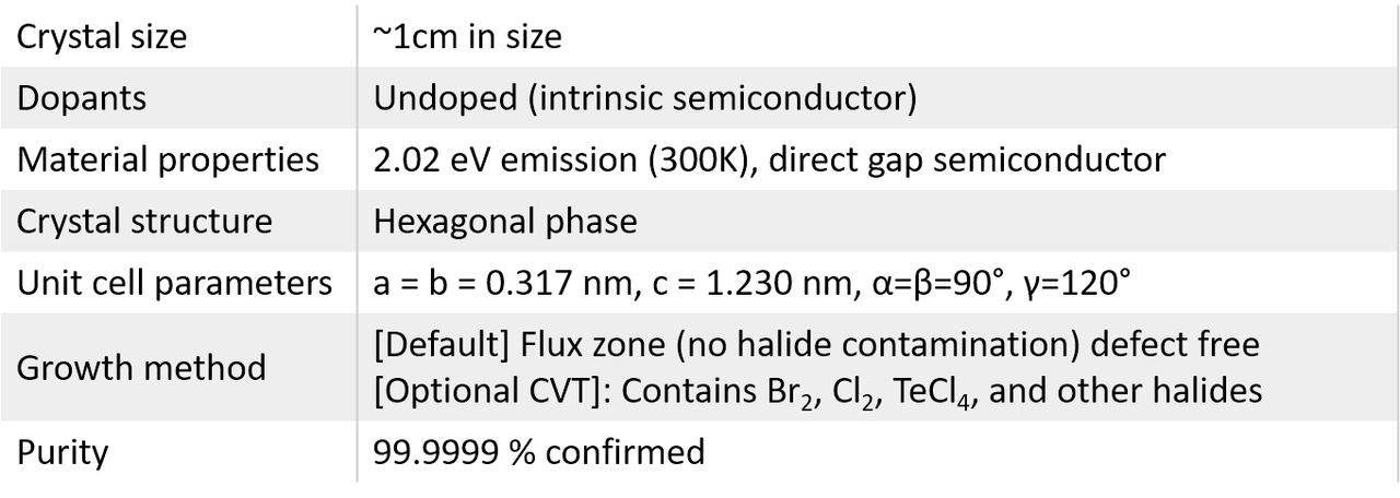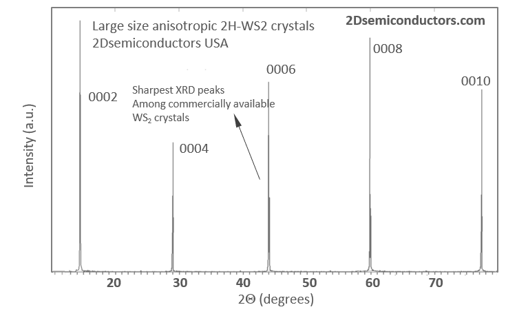 14 years of growth optimization in chemical vapor transport (CVT) as well as flux growth lead to our flawless WS2 crystals: Our large size (~1cm in size) vdW WS2 crystals are treated as gold standards in 2D materials field. The only commercial WS2 crystals that come with guaranteed valleytronic and PL responses. WS2 crystals from 2Dsemiconductors are known for its superior valleytronic performance, perfect crystallization, defect free structure, extremely narrow PL bandwidths, clean PL spectra (free of bound exciton shoulders), and high carrier mobility. Thousands of scientific articles have cited us and used these crystals for scientific accuracy and clean signals. Electronic dopants: Please also see our n- and p-type WS2 crystals doped with Au, Re, Nb, or other transition metal atoms.