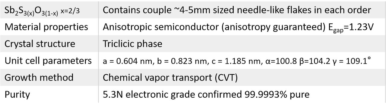 Tin sulfooxide is a ternary alloy belonging to M2X3 family of materials. Our crystals has the chemical formula of Sb2S3xO3(1-x) where x composition ratio has been fixed to x=2/3. However, if your research requires other ternary composition, please contact us to synthesize a new batch for your team. Sb2S2O ternary alloys are visible spectrum semiconductors with predicted band gap of 1.25 eV. These alloys provide transition across Sb2S3 and Sb2O3 compounds corresponding to x=1 and x=0.