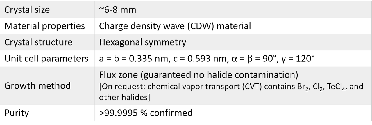 Flux zone vs. CVT growth method: Contamination of halides in layered crystals are well known cause for their reduced electronic mobility, reduced anisotropic response, poor e-h recombination, low-PL emission, and lower optical absorption. Flux zone technique is a halide free technique used for synthesizing truly electronic grade vdW crystals. This method distinguishes itself from chemical vapor transport (CVT) technique provides quick (~2 weeks) growth but poor crystalline quality while flux method takes ~3 months, ensures slow crystallization for perfect atomic structuring, and impurity free crystal growth. During check out just state which type of growth process is preferred. Unless otherwise stated, 2Dsemiconductors ships Flux zone crystals as default choice. Flux zone grown crystals come with guaranteed CDW behavior whereas CVT grown crystals might not exhibit CDW. If you research needs STM grade surfaces or even STM samples (flat crystals mounted on conductive STM holders) please contact us, we will be happy to arrange these samples.