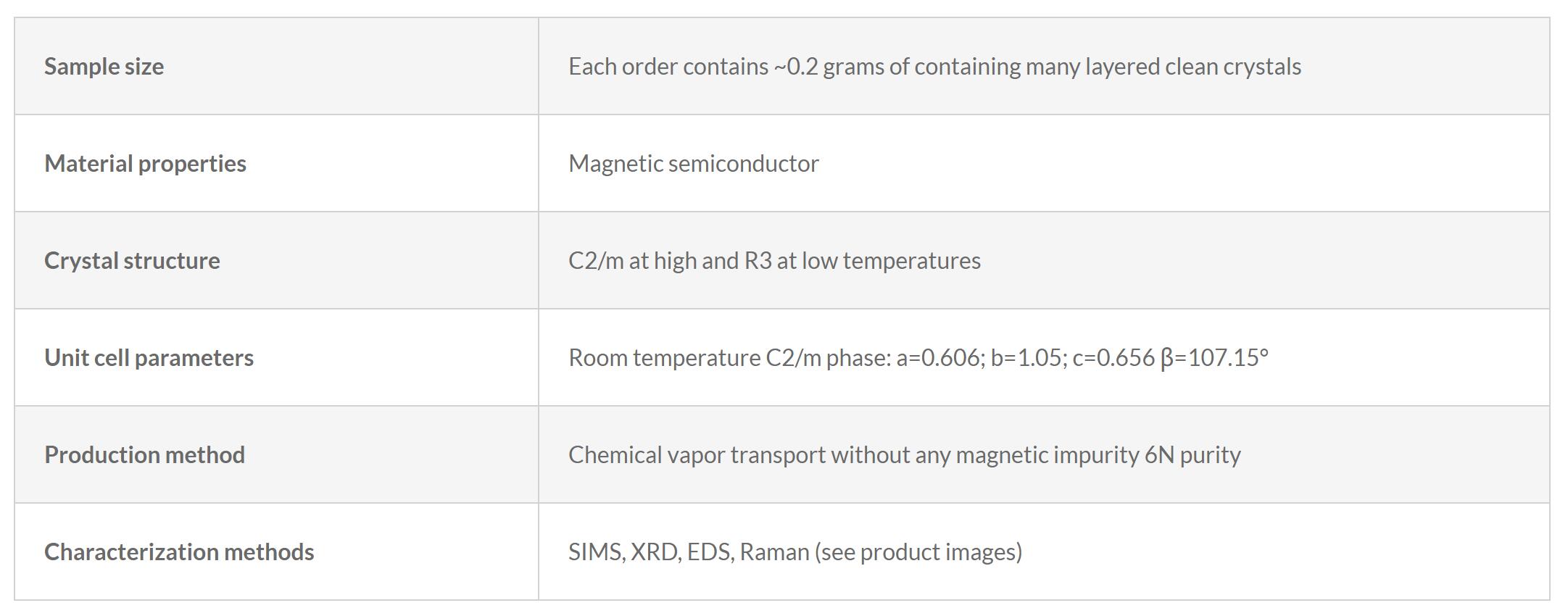 CrCl3 (chromium triichloride) is layered antiferromagnet which is rather easy to exfoliate down to monolayer and shows excellent environmental stability. It exhibits a magnetic ordering temperature between 14 to 17 K. CrCl3 is at the cusp of ferromagnetic ordering upon small amount of applied magnetic field strength. Moreover, recent studies have shown that CrCl3 layered crystals undergo a crystallographic phase transition near 240 K from monoclinic (C2/m) to rhombohedral (R3) at low temperatures. Our CrCl3 crystals are grown using chemical vapor transport technique without using any transport chemical agent to ensure no contamination is present. Our precursors are purified with added care to eliminate any magnetic impurities or magnetic dopants to eliminate magnetic contamination effects. All these products are handled using non-magnetic tweezers and in non-magnetic environment with tools that are free of magnetic impurities to ensure intrinsic magnetic properties can be confidently measured and probed.
