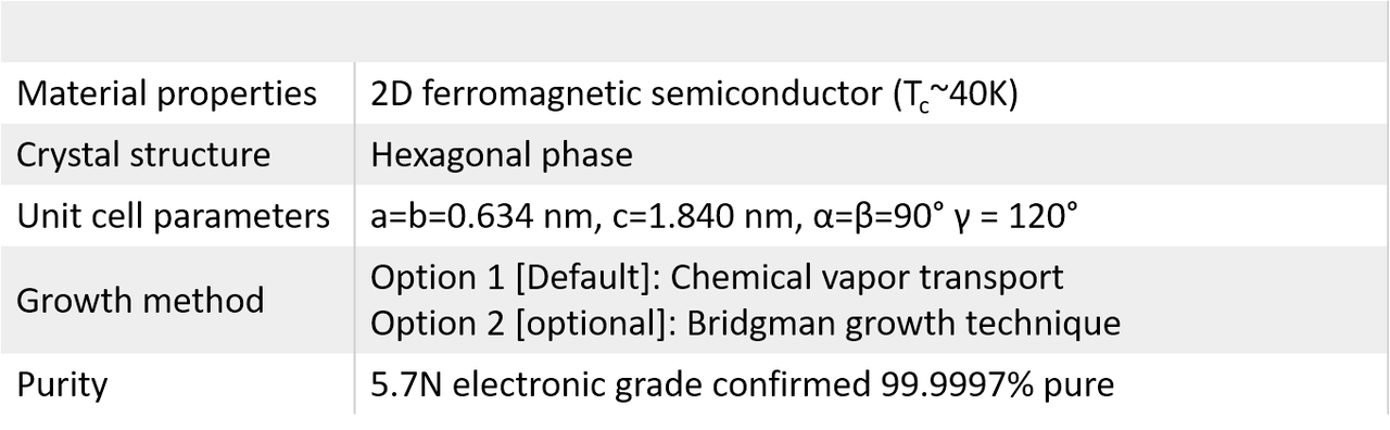 Chromium bromide (CrBr3) is a 2D ferromagnetic semiconductor with a Curie temperature of ~40K. Crystals exhibit perfect 0001 plane orientation as well as perfect in-plane crystallinity as evidenced by XRD and Raman measurements. Layers are largely decoupled from each other and can be exfoliated down to monolayers using conventional mechanical exfoliation technique. CrBr3 is an environmentally sensitive material, we recommend our customer to handle these crystals in the glove box, argon rich environment, or keep them in vacuum boxes prior to actual measurements.