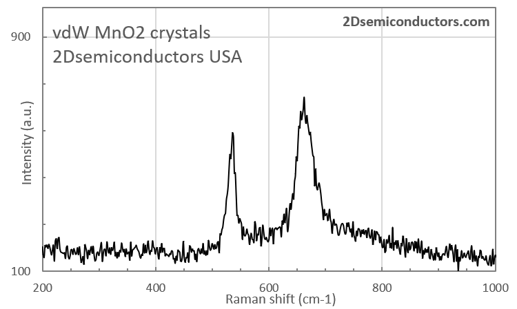 MnO2 is 2D catalytic and electronic grade semiconducting 2D material. In the bulk form, MnO2 has 1.5 eV predicted band gap while it has been anticipated to increase to 2.0 eV in the monolayer form [1]. Environmentally stable delta (layered) phase of MnO2 has been synthesized using float zone technique at centimeter scales. In its delta-phase, MnO2 crystal structure assumes R-3m phase (see images) which contains layers stacked onto each other vdW bonding. Each layer has three atomic thick arrangement consisting of O-Mn-O layers as shown in the diagram in product images. The material is environmentally stable in air, water, and different gases. Layers can easily exfoliated onto desired substrates with minimal efforts as shown in the product images. Please see our Raman spectrum and comparison to the published literature [2] in Fig2b.