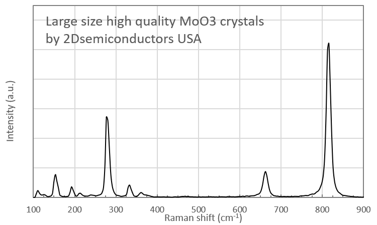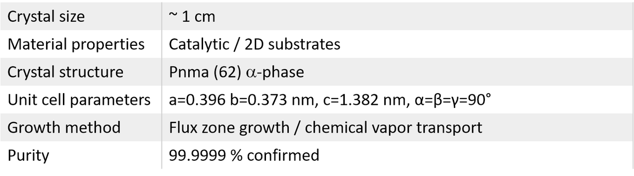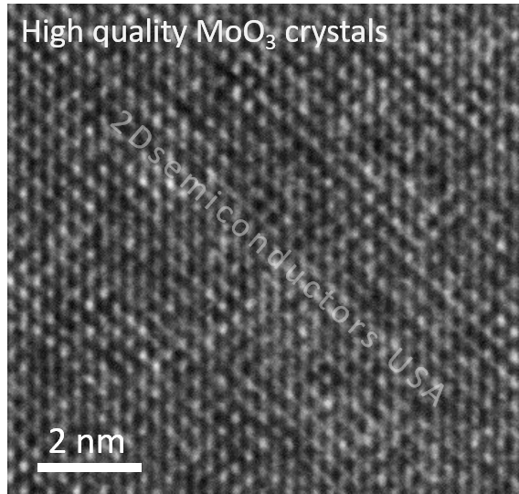 a-MoO3 is a layered vdW semiconductor with a crystal structure that belongs to the space group Pbnm 62 (see unit cell parameters below). In its layered form, Each layer has three atomic thick arrangement consisting of MoO6 octahedra layers as shown in the diagram in product images. The material is environmentally stable in air, water, and different gases. Layers can easily exfoliated onto desired substrates with minimal efforts as shown in the product images.