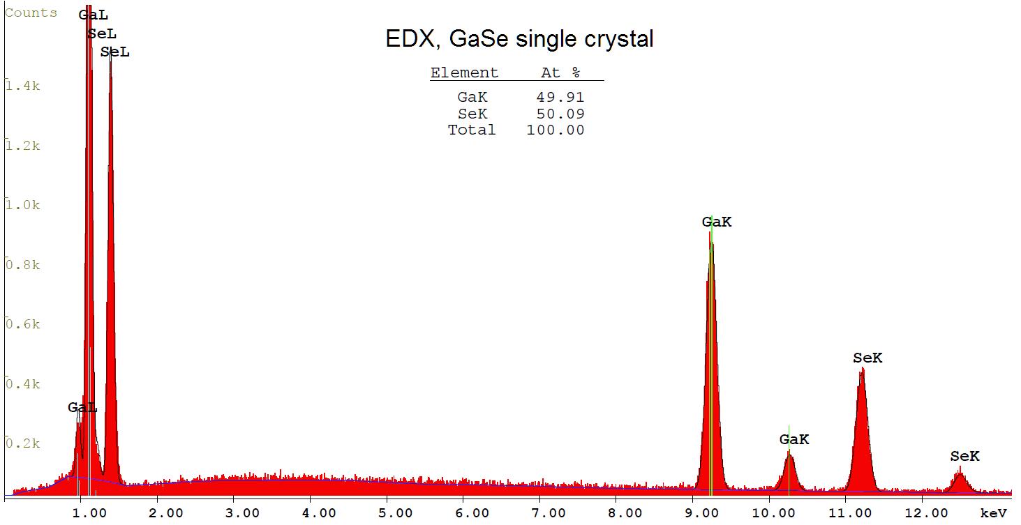 Stoichiometric analysis of a single crystal GaSe by Energy-dispersive X-ray spectroscopy (EDX).