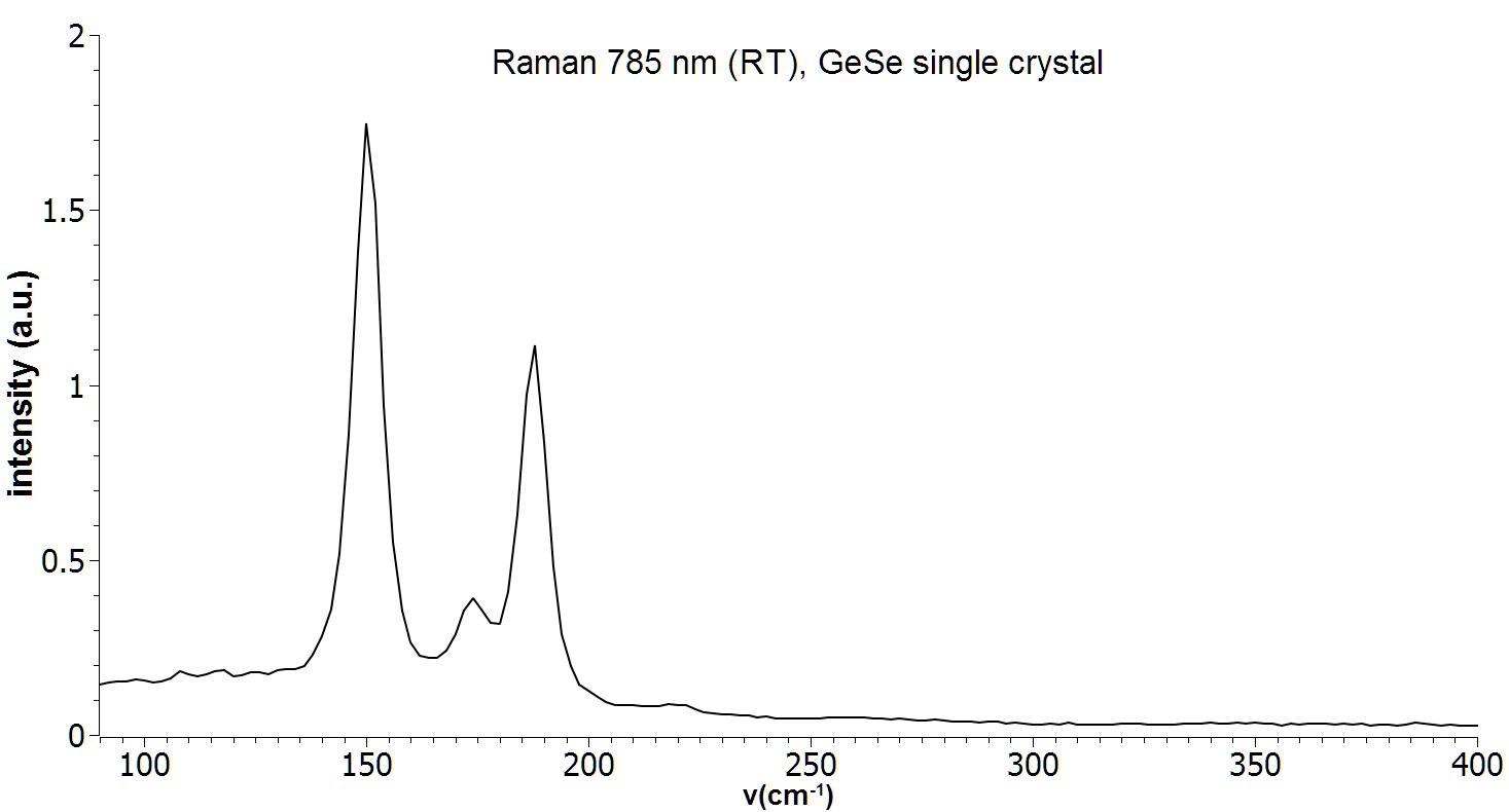 Raman spectrum of a single crystal GeSe. Measurement was performed with a 785 nm Raman system at room temperature.