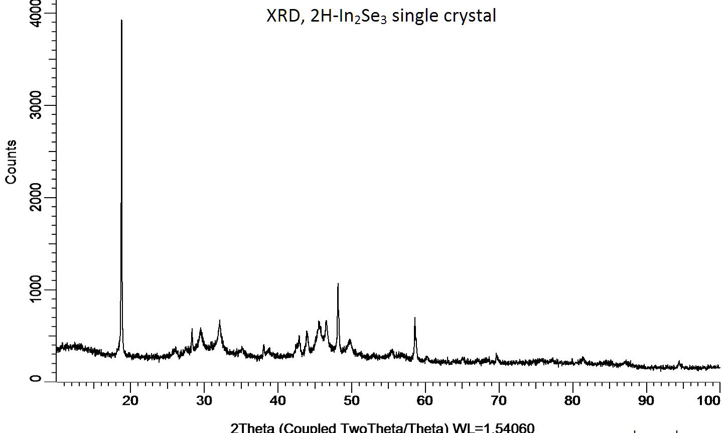 Powder X-ray diffraction (XRD) of a single crystal In2Se3. X-ray diffraction was performed at room temperature using a D8 Venture Bruker.