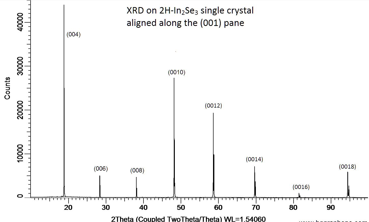 X-ray diffraction on a 2H-In2Se3 (Indium Selenide) single crystal aligned along the (001) plane. XRD was performed at room temperature using a D8 Venture Bruker. The 8 XRD peaks correspond, from left to right, to (00l) with l = 4, 6, 8, 10, 12, 14, 16, 18