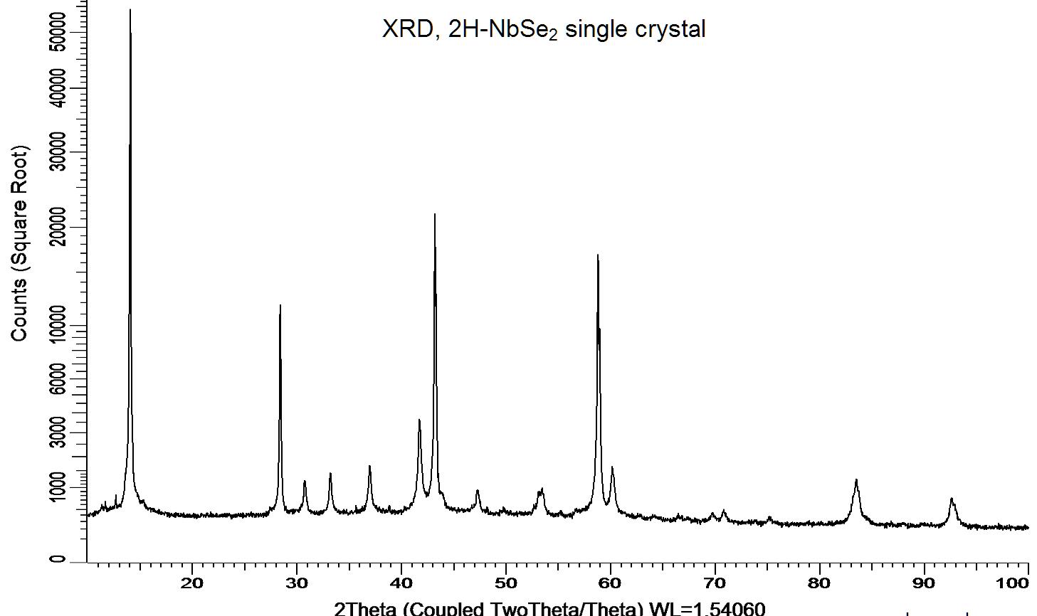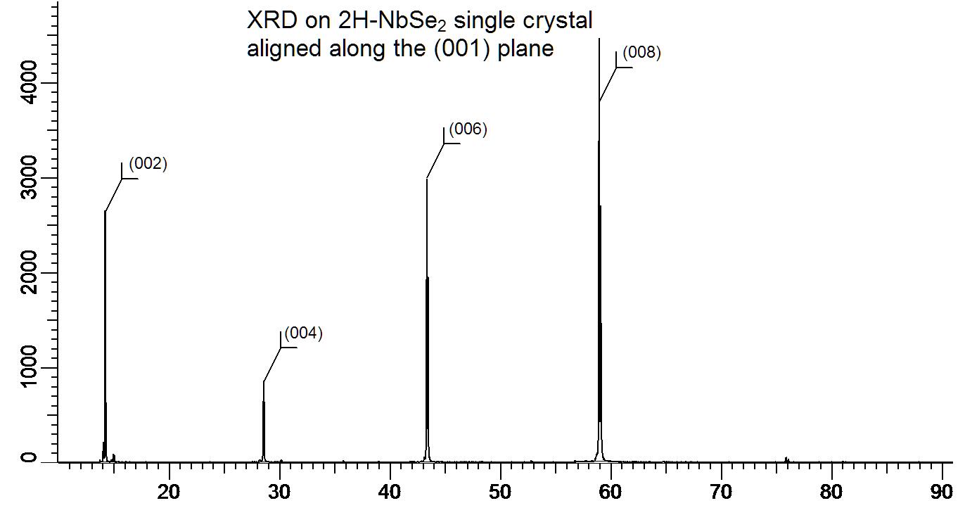 Powder X-ray diffraction (XRD) of a single crystal 2H NbSe2. X-ray diffraction was performed at room temperature using a D8 Venture Bruker.