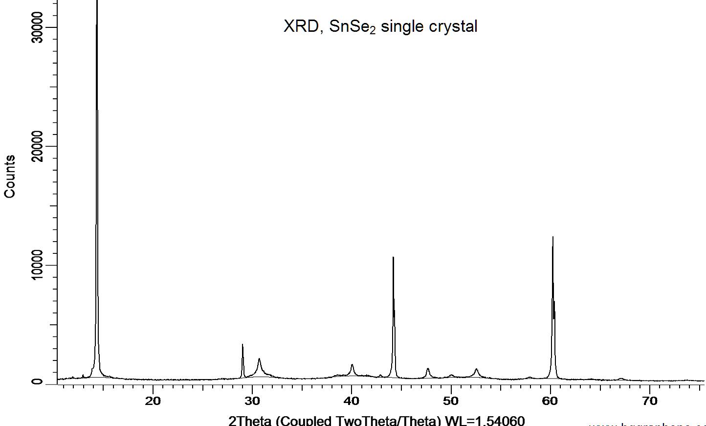 Powder X-ray diffraction (XRD) of a single crystal SnSe2. X-ray diffraction was performed at room temperature using a D8 Venture Bruker.
