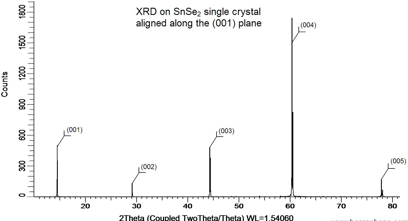 X-ray diffraction on a SnSe2 single crystal aligned along the (001) plane. XRD diffraction was performed at room temperature using a D8 Venture Bruker. The 5 XRD peaks correspond, from left to right, to (00l) with l = 1, 2, 3, 4, 5