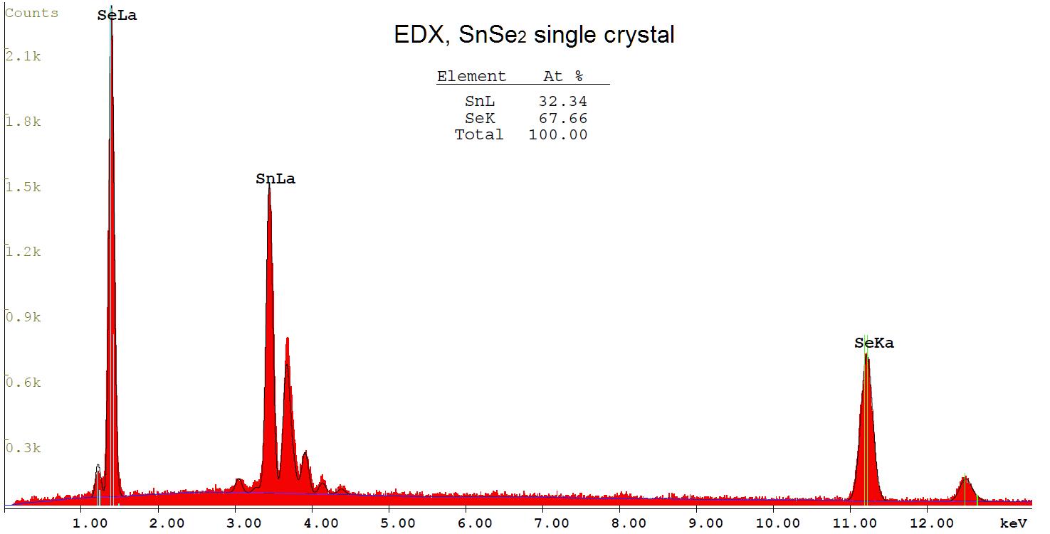 Stoichiometric analysis of a single crystal SnSe2 by Energy-dispersive X-ray spectroscopy (EDX).