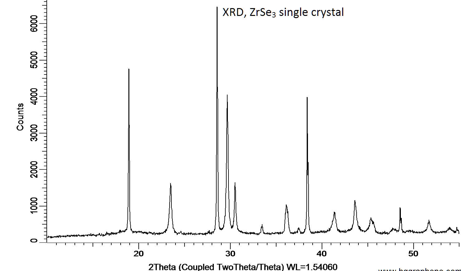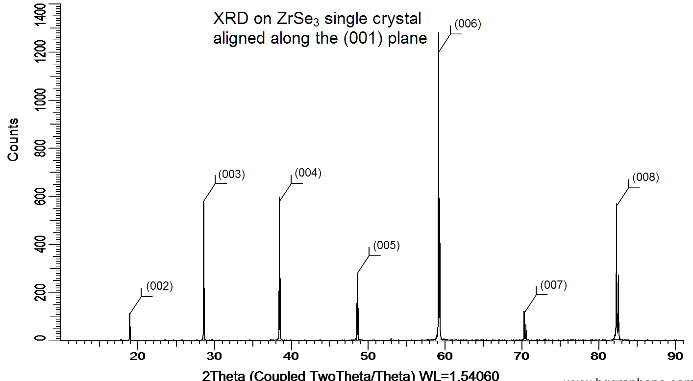 Powder X-ray diffraction (XRD) of a single crystal ZrSe3. X-ray diffraction was performed at room temperature using a D8 Venture Bruker.