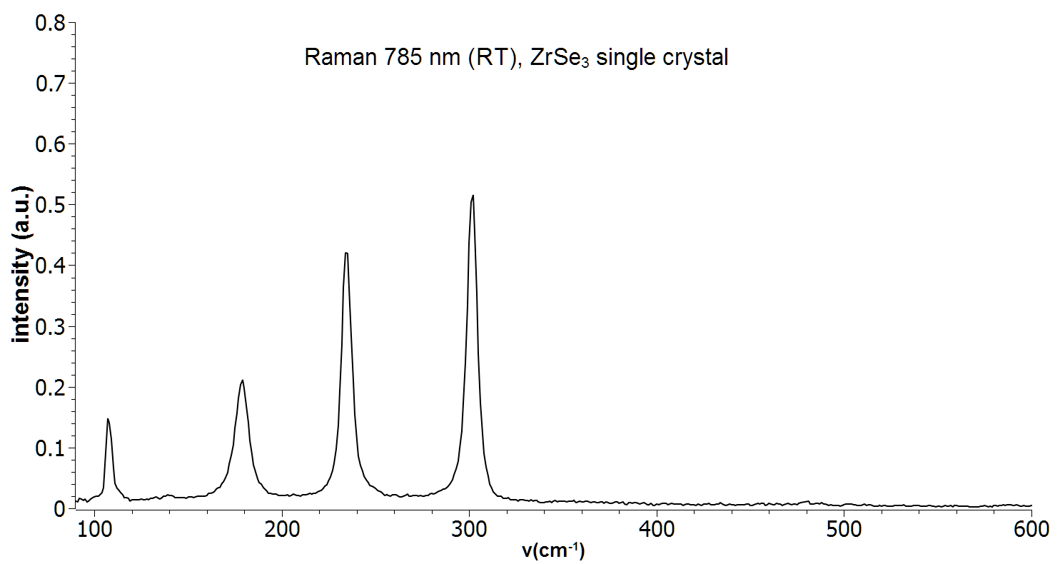 Raman spectrum of a single crystal ZrSe3. Measurement was performed with a 785 nm Raman system at room temperature.