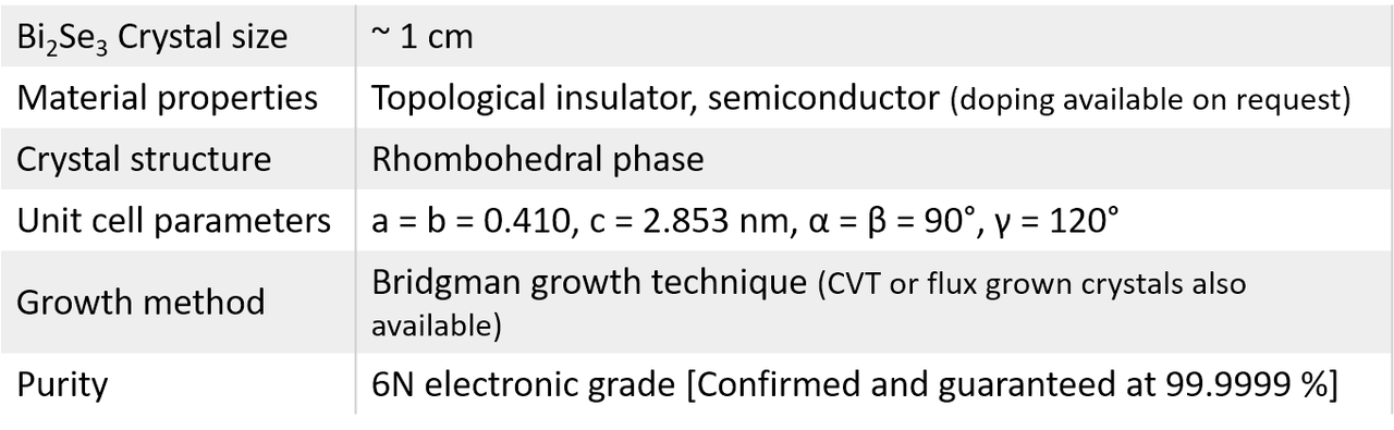P-type electronically doped Bismuth Selenide (Bi₂Se₃) Developed at our facilities since early 2011 to optimize the perfect stoichiometry and stabilize the topological insulator state. Bismuth Selenide (Bi₂Se₃) Developed at our facilities since early 2011 to optimize the perfect stoichiometry and stabilize the topological insulator state. Bi2Se3 crystals are topological insulator material in which its bulk is insulating while its surface states are conducting. The surface states of topological insulator are robust against any external perturbation because such states are protected by time-reversal symmetry. Similar to transition metal dichalgonides and graphite, Bi₂Se₃ is also layered material with weak interlayer coupling. Our crystals are develop in our laboratories in last two years and are highly crystalline. Raman spectrum displays very sharp and clear modes with FWHM less than 4cm-1. If your research needs doping in Bi2Se3, we can also incorporate Ca, Nb, Ni, and Au dopants in Bi2Se3 crystals.