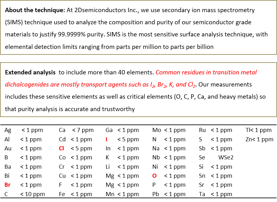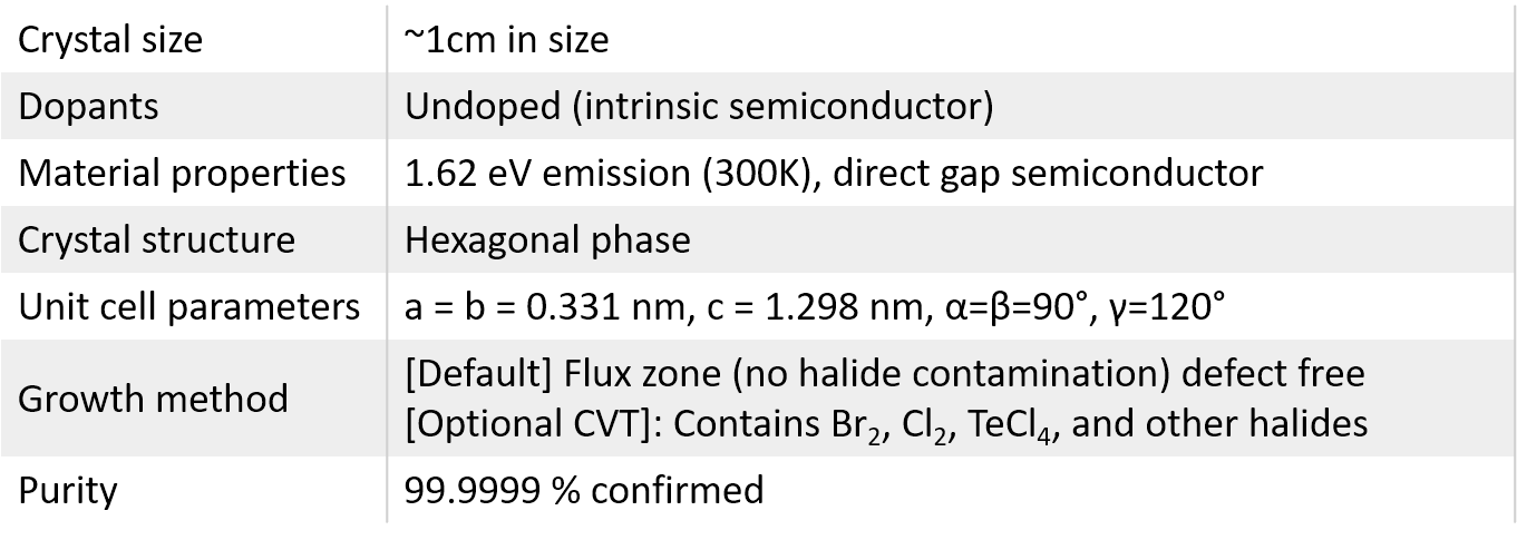 14 years of growth optimization lead to our flawless WSe2 crystals: Our large size vdW WSe2 crystals are treated as gold standards in 2D materials field. WSe2 crystals from 2Dsemiconductors are known for its superior valleytronic performance, perfect crystallization, defect free structure, extremely narrow PL bandwidths, clean PL spectra (free of bound exciton shoulders), and high carrier mobility. Thousands of scientific articles have cited us and used these crystals for scientific accuracy and clean signals. Please also see our n- and p-type WSe2 crystals doped with Au, Re, Nb, or other transition metal atoms.