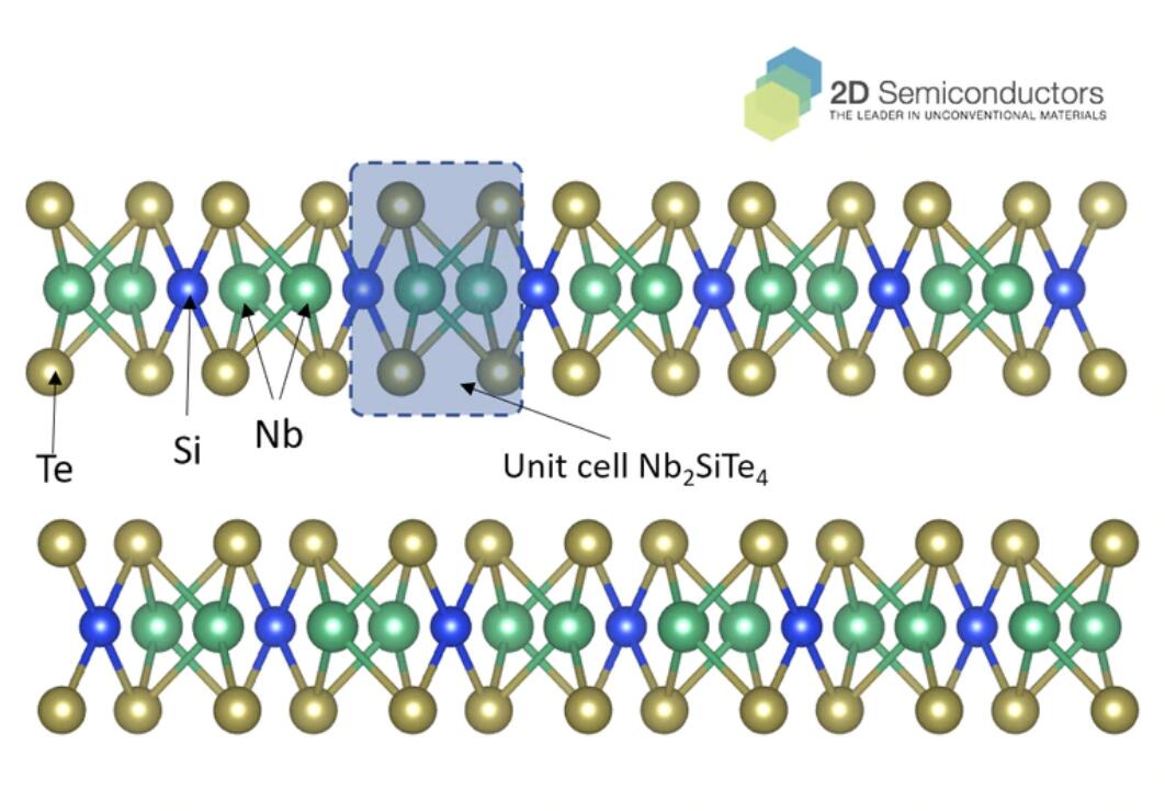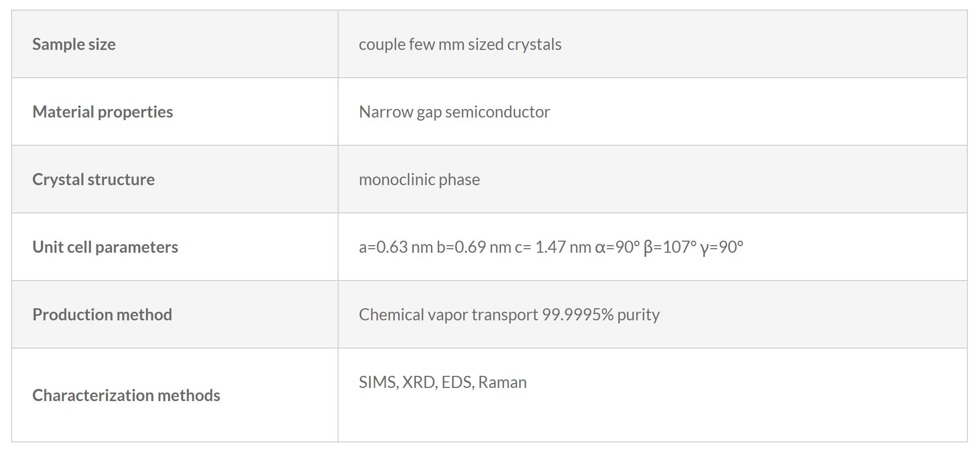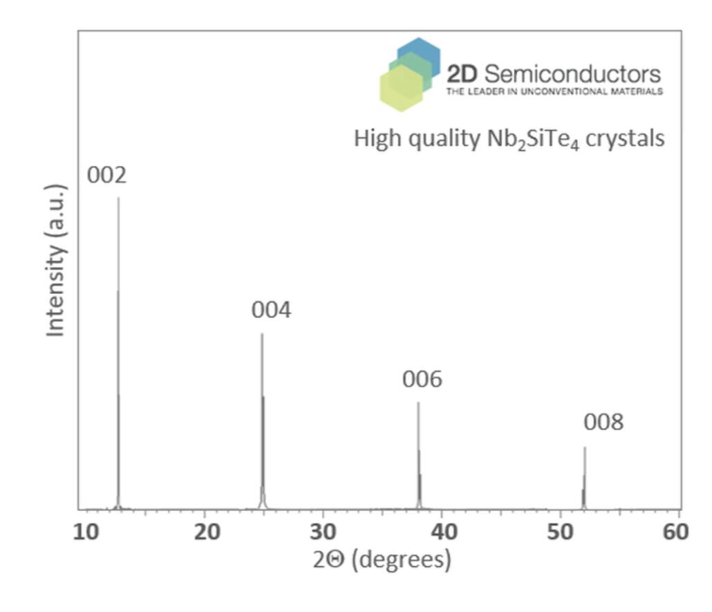 Nb2SiTe4 is a layered narrow gap semiconductor. It crystallizes in monoclinic phase (P121/c1) wherein Nb and Si cations are sandwiched between Te anion atoms forming the individual layers. Nb2SiTe4 crystals are all perfectly layered and easy to exfoliate much similar to MoS2 and Bi2Te3 crystals. Overall it exhibits 0.4 eV optical band gap which has important applications towards mind-infrared and infrared technologies. Our Nb2SiTe4 crystals have been synthesized through chemical vapor transport (CVT) technique at high purity limits (99.9995% or higher) to ensure crystals are environmentally stable and optical/electronic grade. Each order comes with couple mm sized crystals as shown in the product images.