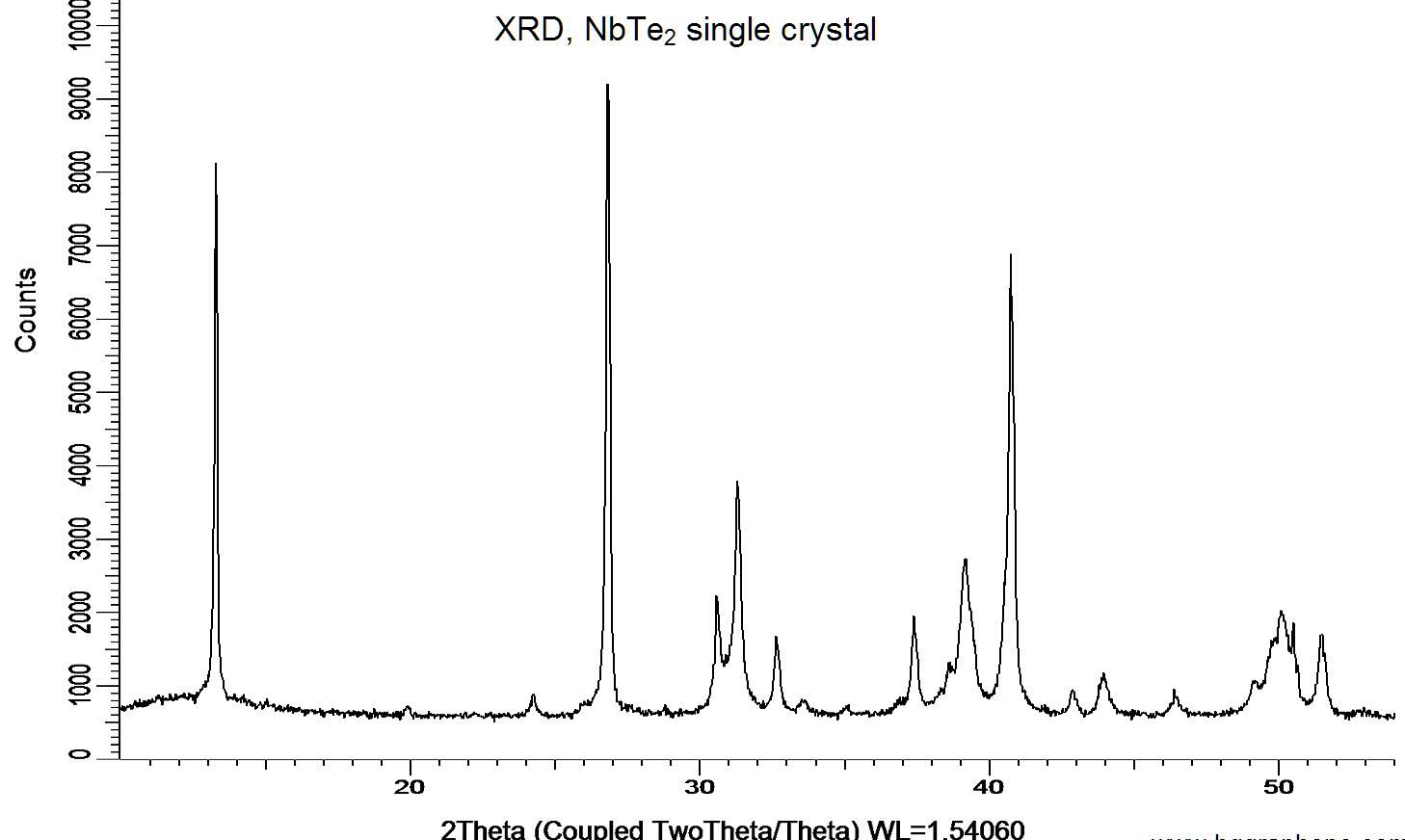 Powder X-ray diffraction (XRD) of a single crystal NbTe2. X-ray diffraction was performed at room temperature using a D8 Venture Bruker.