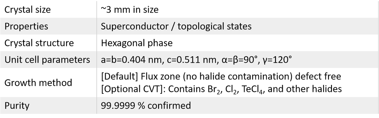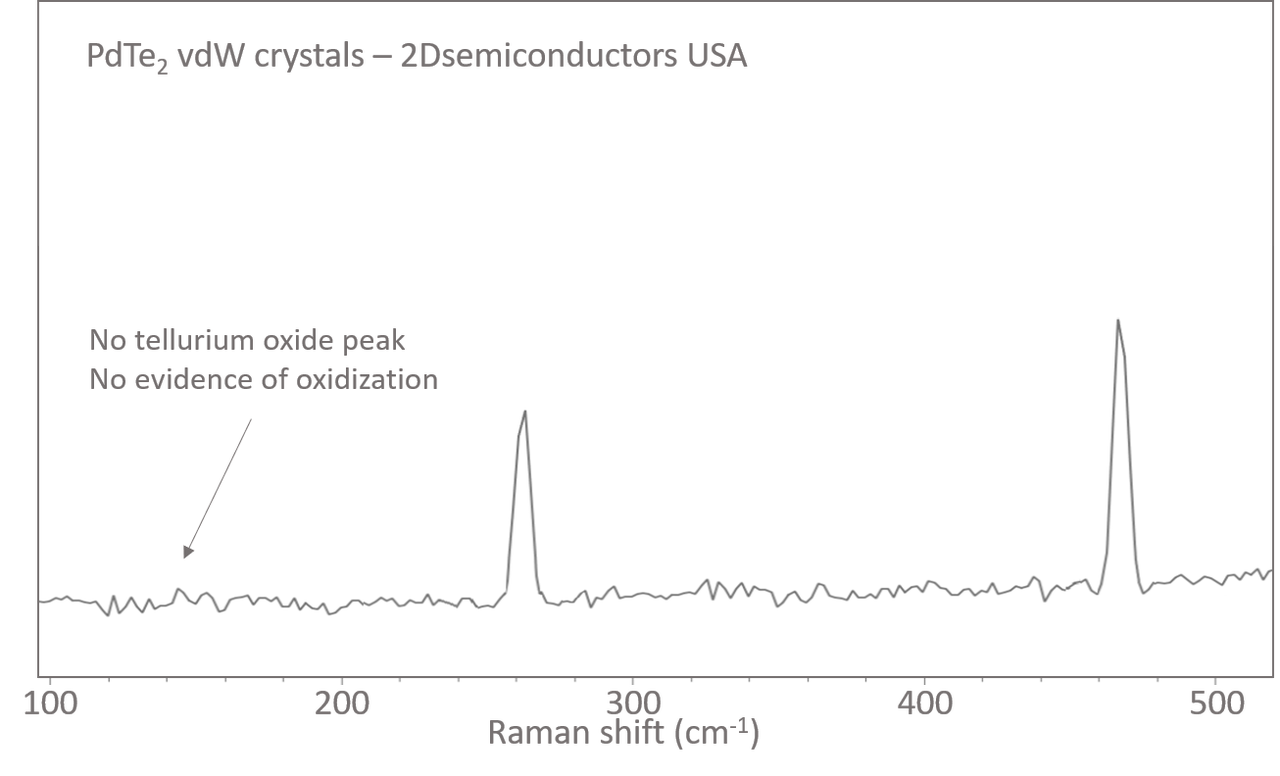 PdTe2 (palladium ditelluride) is vdW layered metal crystallizing in hexagonal phase structure. It exhibits superconductivity below 2K in bulk topological predicted response. Our PdTe2 crystals are the only commercial crystals that does not suffer from oxidization due to low defect concentrations (see Raman spectrum). PdTe2 crystals exhibit extraordinary crystallinity with extremely low defect concentrations as low as 1E9 cm-2 levels. The presence of defects are well-known cause for reduced topological and superconducting responses, as well as higher resistance. Considering these, PdTe2 crystals are synthesized through flux zone growth but our R&D can also offer chemical vapor transport (CVT) grown crystals with larger amount of defects and lower crystallinity.