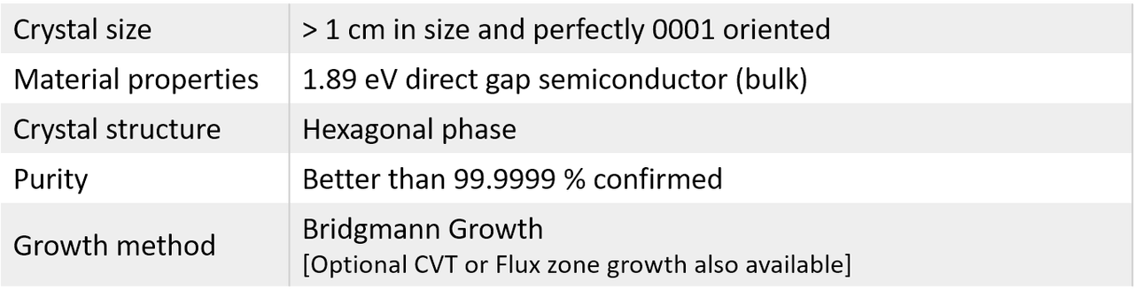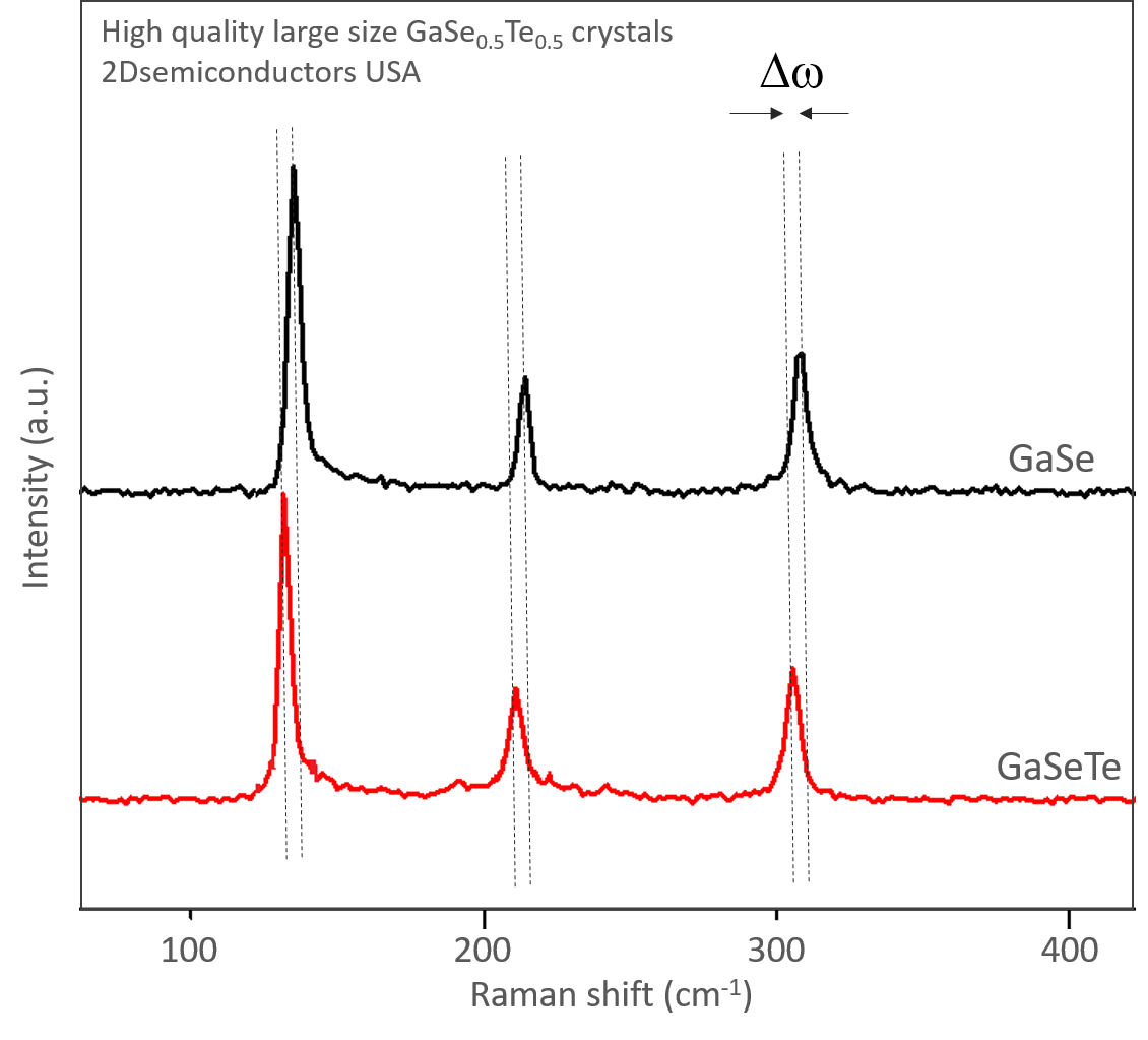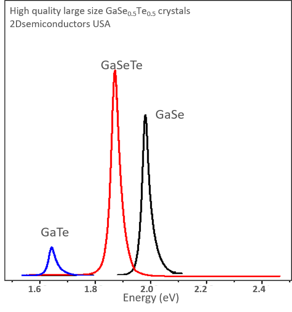 The only commercially available GaSeTe alloys: Bulk Gallium selenide telluride has a band-gap at 1.89 eV and display strong photoluminescence at the same energy. Crystals are perfectly layered in the c-axis direction, comes ready for exfoliation, and crystals have an impressive environmental stability. Single crystal GaSeTe comes ready for exfoliation and is ideal for 2D research. GaSeTe alloys only come at ~50% (GaSe0.5Te0.5) alloying ratio due to phase separation phenomena taking place at other compositions.