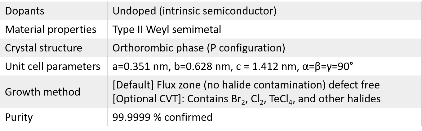 WTe2 is a Type-II Weyl semimetal with carrier density spanning from 1E20-1E21 cm-3. Unlike other sources, our growth involves highly sophisticated float zone technique which allows us to drive out defects intentionally during the growth process to achieve defect free crystals. In our experience, conventional chemical vapor transport (CVT) technique severely introduces defects and impurities into the material, and alters its must desired intrinsic properties. Furthermore, CVT method produces defected crystals which leads to environmental instability. See Figures for characterization results. Our crystals are grown in three (3) months period to achieve environmentally stable, pure, and intrinsic Weyl response crystals.