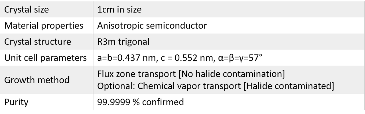 Growth method matters> Flux zone or CVT growth method? Contamination of halides and point defects in layered crystals are well known cause for their reduced electronic mobility, reduced anisotropic response, poor e-h recombination, low-PL emission, and lower optical absorption. Flux zone technique is a halide free technique used for synthesizing truly semiconductor grade vdW crystals. This method distinguishes itself from chemical vapor transport (CVT) technique in the following regard: CVT is a quick (~2 weeks) growth method but exhibits poor crystalline quality and the defect concentration reaches to 1E11 to 1E12 cm-2 range. In contrast, flux method takes long (~3 months) growth time, but ensures slow crystallization for perfect atomic structuring, and impurity free crystal growth with defect concentration as low as 1E9 - 1E10 cm-2. During check out just state which type of growth process is preferred. Unless otherwise stated, 2Dsemiconductors ships Flux zone crystals as a default choice.