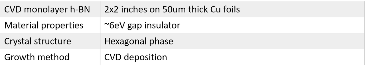 Single layer h-BN (Boron Nitride) monolayer thick film is grown onto 50 um thick copper foils. h-BN is an insulator with a direct band gap of 6 eV with strong ionic bonding between B-N atoms. Our h-BN CVD process has been adopted in order that defect density has been kept low (~1E10-1E11 cm-2) and single domain sizes have been increased to reduce 1D grain boudary defect concentrations. Monolayer h-BN sheets measure ~5cm x 5cm or ~2x2 inches in size.