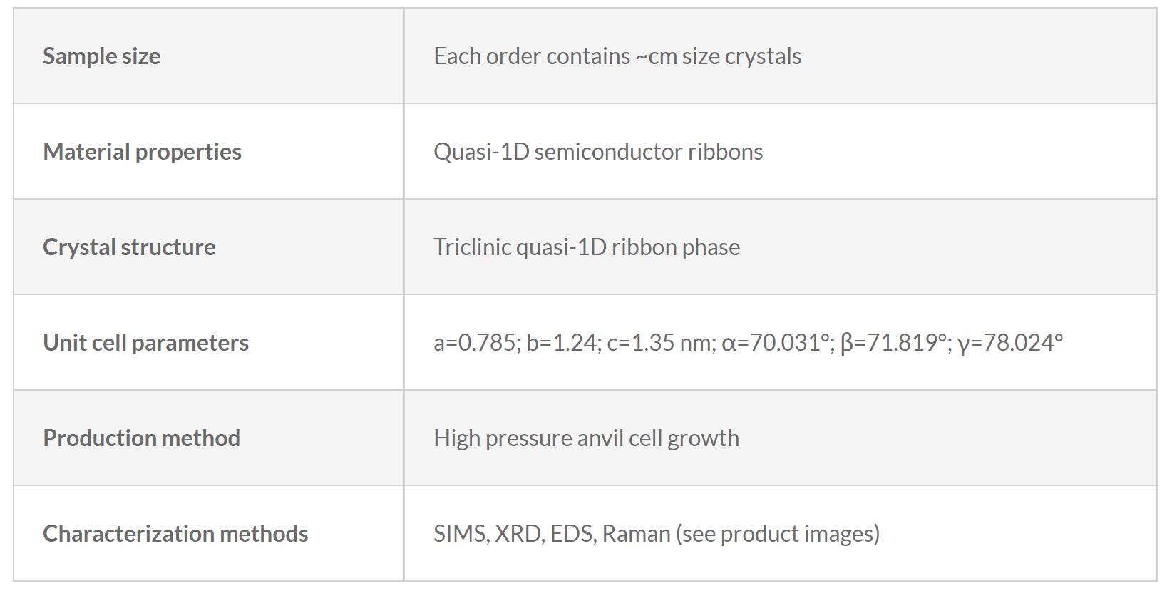 Red phosphorene ribbons are new class of anisotropic semiconductors (~1.7 eV band gap). These quasi-1D crystals have been synthesized through high pressure anvil cell method to realize exfoliation grade quasi-1D red phosphorene nanoribbons. Our product consists of large size (~1cm) crystals containing fiber / needle like red phosphorene sheets as shown in product images. Product has rated 99.9995% purity and high electronic, structural, and optical grade quality.