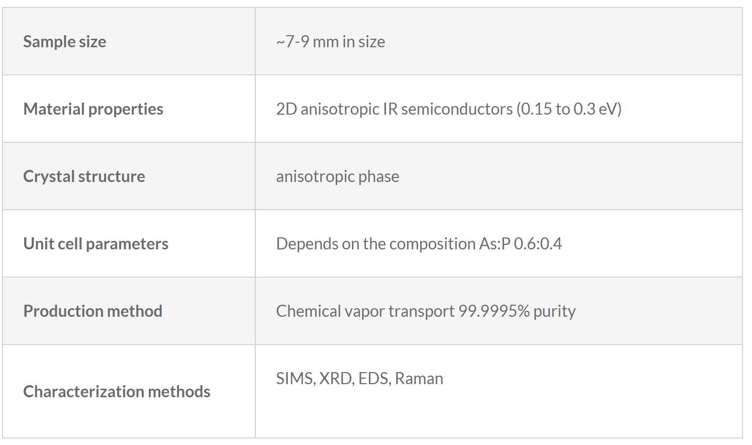 Black arsenic phosphorus (Black-AsP) alloys are 2D anisotropic materials which strong similarities to parent BLACK-ARSENIC and BLACK-PHOSPHORUS vdW crystals. Our b-AsP crystals were synthesized with high crystalline quality and electronic/optical performance in mind. We have utilized our patent pending high pressure chemical vapor transport technique (HP-CVT) using puratronic quality gray arsenic (99.9999% purity) and electronic grade red phosphorus (99.9999% purity) as starting materials. High pressure range allowed us to nearly eliminate additive mineralizers (SnI4) commonly used and known to introduce high defects in the crystal. With this technique we were able to reach unmatched 99.9998% or higher purity rates. Our B-AsP crystals come at As:P 0.6:0.4 to push the limit of IR semiconductor range. In this composition range, the materials exhibit perfect vdW layered character with easy exfoliation characteristics. Each order comes with large size crystals ranging from 7-10 mm in size sufficient for years of supply.