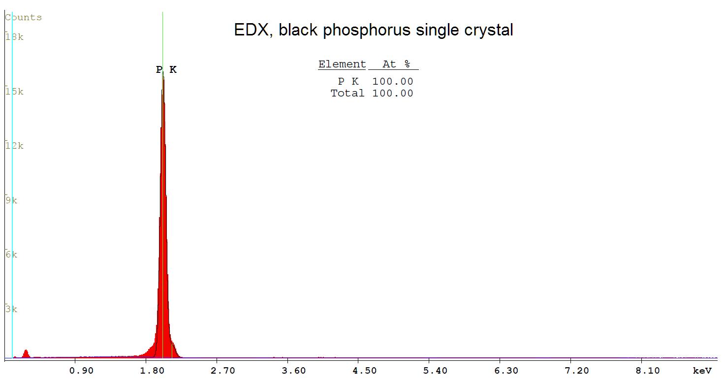 Stoichiometric analysis of a single crystal black phosphorus by Energy-dispersive X-ray spectroscopy (EDX).