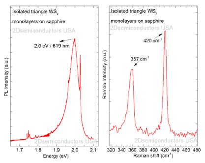 Isolated monolayer thickness WS2 are grown onto c-cut (0001) sapphire substrates. This particular product contains monolayer thickness WS2 triangular flakes randomly distributed across sapphire substrate. While some regions reach continuity with coalesced WS2 triangles, this sample contains well-separated triangles for advanced spectroscopy, microscopy, and electronic measurements. Synthesized monolayer WS2 triangles are highly luminescent and Raman spectroscopy studies also confirm the monolayer thickness.