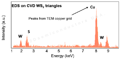 Energy dispersive X-ray spectroscopy (EDX) characterization on CVD grown full area coverage WS2 on sapphire confirming W:S 1:2 ratios