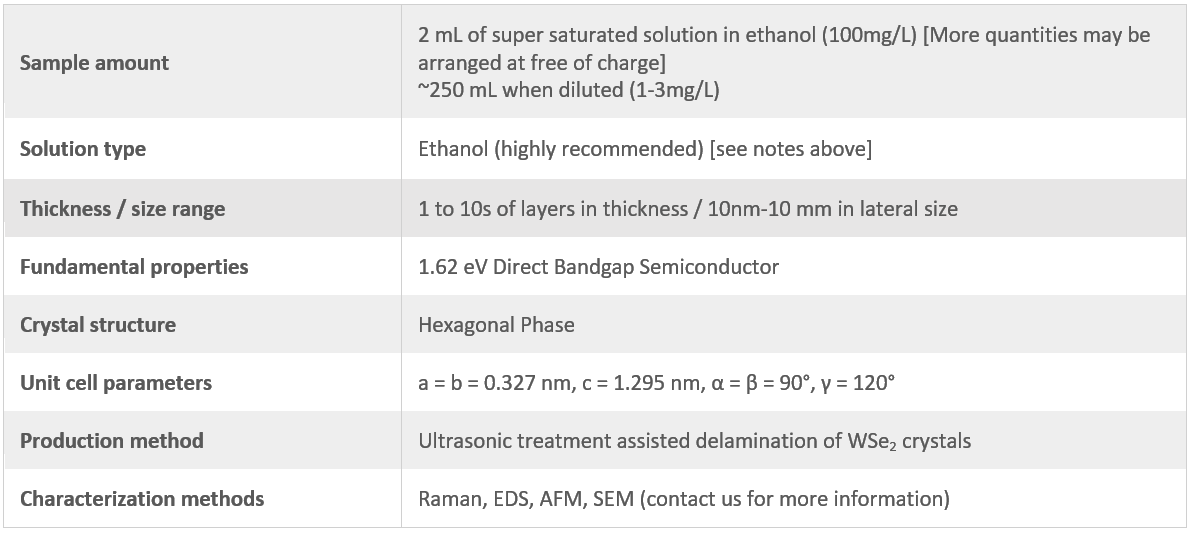 This product contains WSe2 flakes solution in ethanol. The WSe2 solution has been developed by ultrasonic treatment of bulk WSe2 high quality crystals synthesized through vapor transport (CVT) technique. Since the starting material (CVT grown WSe2 crystals) is highly crystalline, ultrasonic treatment to delaminate WSe2 layers yields highly crystalline WSe2 mono-, few-, and some thick layers suspended in ethanol solution. The crystallinity of WSe2 nanomaterials has been confirmed through electron energy dispersive spectroscopy (EDAX), Raman spectroscopy (FWHM<5 cm-1), and scanning electron microscopy (SEM) measurements. Depending on the thickness of the layers, flakes deposited on different substrates produce light emission (photoluminescence). Lateral sizes of WSe2 flakes deposited onto different substrates range from ~10nm - ~10 mm while thickness range from 1L to 10s of layers.