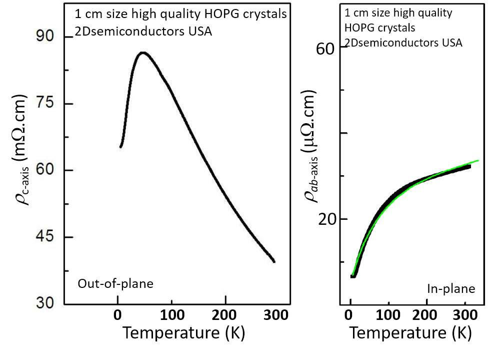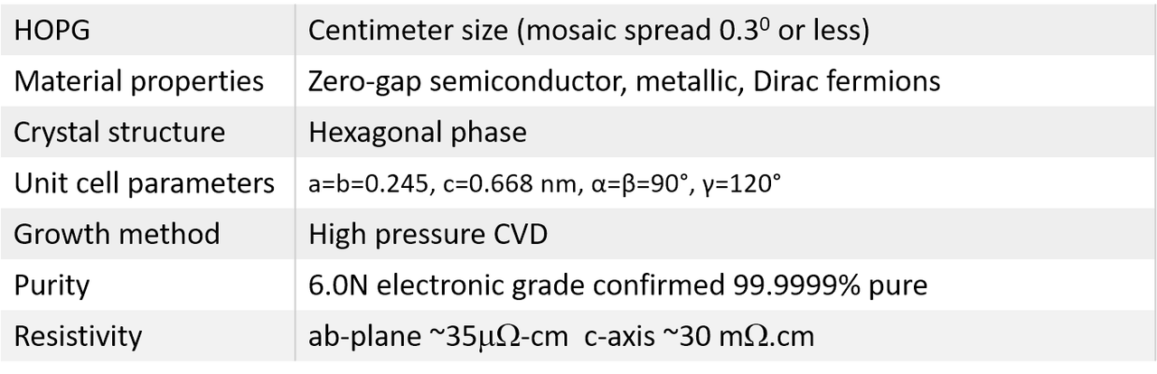 Highly oriented pyrolytic graphite is a zerogap semiconductor with metallic like properties. Often times graphite also referred as semi-metallic since its conduction and valance bands overlap each other at different high symmetry points. 2Dsemiconductors USA have been working in the last 3 years to acquire expertise in carbonaceous materials such as graphite, graphene, diamond, and other polymeric material systems. Highly oriented pyrolytic graphite has been created by CVD enhanced pyrolysis technique. 2Dsemiconductors only provides highest quality HOPG crystals (in the literature it is often referred as ZYA grade). Instead of unknown terminalogies adopted, graphite, HOPG, and Kish graphite materials are characterized by a low mosaic spread angle. This angle correlates to how well individual graphite crystallites (single domains) are aligned with each other. The smaller the mosaic spread is the better alignment between single domains, easier exfoliation characteristics, and larger graphene sheets can be obtained. The best HOPG samples have mosaic spreads of less than 0.5 degree. Our crystals differ from other vendors in that our crystals consistently display only 0.3 degree mosaic spread.