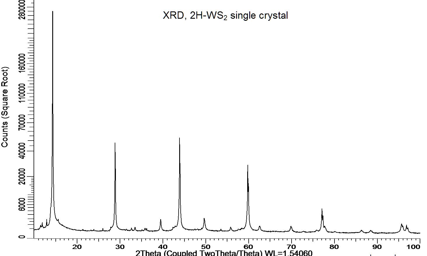 Powder X-ray diffraction (XRD) of a single crystal 2H-WS2. X-ray diffraction was performed at room temperature using a D8 Venture Bruker.
