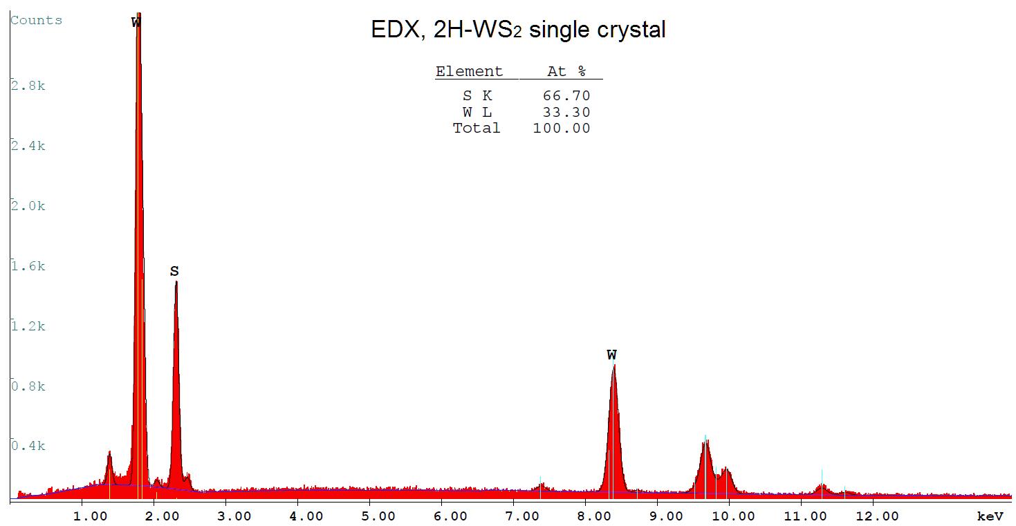 Stoichiometric analysis of a single crystal 2H-WS2 by Energy-dispersive X-ray spectroscopy (EDX).