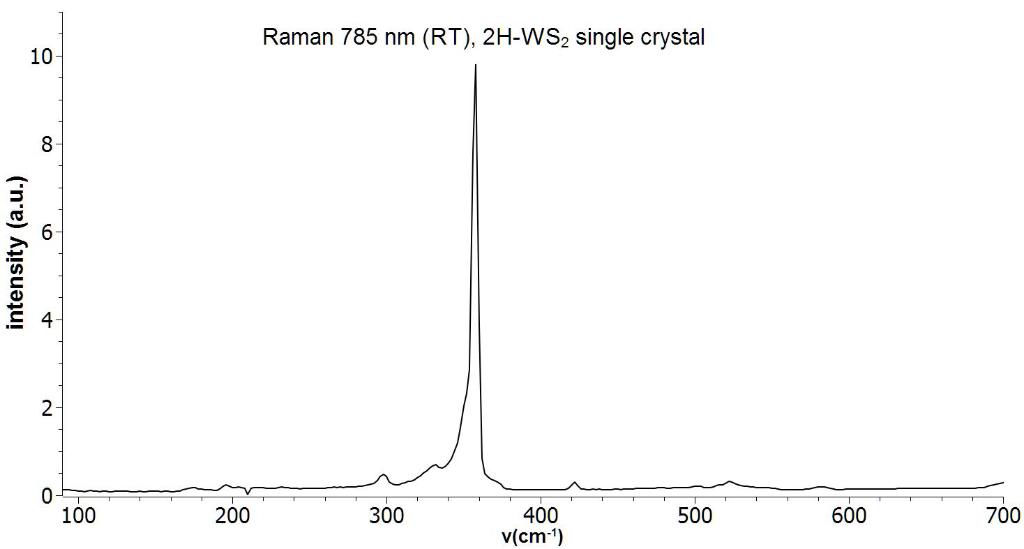 Raman spectrum of a single crystal 2H-WS2. Measurement was performed with a 785 nm Raman system at room temperature.