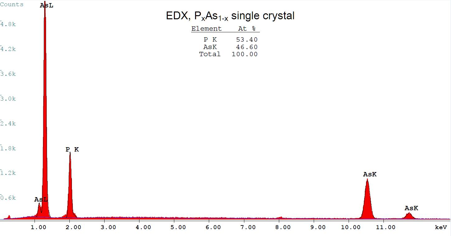 Stoichiometric analysis of a single crystal P-As by Energy-dispersive X-ray spectroscopy (EDX).