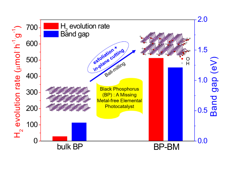 在已知的磷的三种常见的同素异形体(白磷,红磷和黑磷)中,黑磷的发现已有上百年的历史,近几年来发现其具有独特的二维层状结构以及带隙可调等优异性能,并引发了新一轮二维材料的研究热潮。特别地,黑磷具有带隙随着层数可调(块体为0.3 eV,单层为2.0 eV)的特点,使其可充分吸收可见光,从而有可能具有优良的光催化性质,然而实验上还未见报道。
