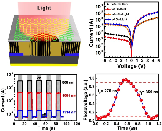 考虑到传统的光电探测器一般采用垂直p-n结的二极管结构,利用强的内建电场及短的电荷传输距离,可以极大地提高响应速度。因此,构筑基于MoSe2同质/异质结的光电探测器是进一步提高器件性能高效可行的方法。基于以上思路,苏州大学的揭建胜教授课题组将成熟的硅工艺和MoSe2优异的光电性质结合起来,充分利用二者的优势,设计构筑了新型高性能Graphene/MoSe2/Si异质结光电探测器,实现了其超快和宽光谱响应。研究者通过磁控溅射,在p型Si基底上大面积生长出具有片层垂直站立取向的MoSe2薄膜,实现了高质量pn结的构筑,强的内建电场可以有效地分离光生载流子。同时由于MoSe2高的面内迁移率,这种特殊的垂直站立层状结构可以确保载流子的快速分离和传输,从而提供了电荷传输的高速通道。另外,通过采用石墨烯作为透明电极,一方面促进了光生载流子的分离,器件整流效应显著增强,有效提高了MoSe2/Si异质结的性能;另一方面进一步增强了载流子收集能力,避免了载流子的堆积和复合。该新型光电探测器结构的构筑为快速响应提供了良好的基础。进一步对器件进行紫外、可见及近红外不同波长的光响应测试,均表现出良好的光探测能力,实现了350-1310 nm的宽光谱响应,以及270 ns的超快响应速度,这些性能代表了目前基于MoSe2或MoS2光电探测器的最好结果之一。