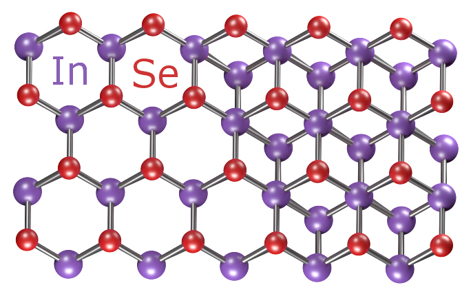 石墨烯是由一层碳原子组成,与石墨烯不同,硒化铟是铟原子(In)和硒原子(Se)的二元化合物,厚度为四个原子,原子排列顺序为Se-In-In-Se。