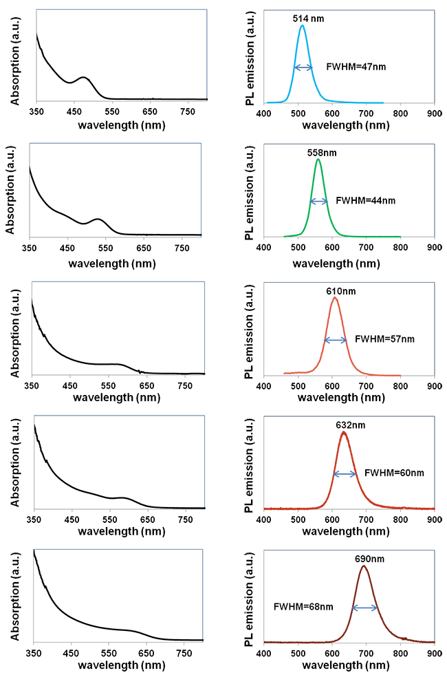 由于其激子波尔半径比Ⅱ-Ⅵ族的大,量子限域效应明显,消光系数大,发射光谱频率覆盖整个可见光范围,并延伸至近红外区域,尤其是不含有重金属元素,InP量子点在平板显示背光源、照明、生物医学标记、指纹识别,以及太阳能领域具有广泛的应用。 应用独特专有技术合成的InP/ZnS量子点具有稳定性好,荧光发射峰范围广,发光效率高,波长可调等诸多优异特性。
