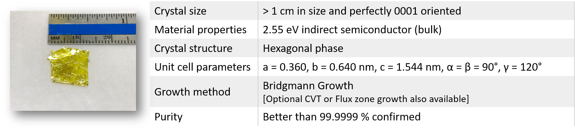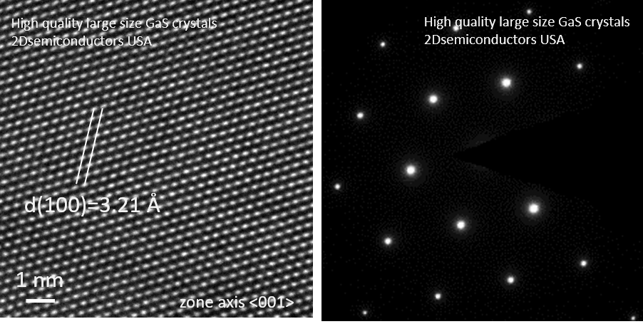 Large size hexagonal phase GaTe (Gallium telluride) crystals have been developed at our facilities using three different growth techniques, namely Bridgman growth, chemical vapor transport (CVT), and flux zone growth, to optimize grain sizes and reduce defect concentrations. In contrast to commonly used chemical vapor transport (CVT) technique, flux grown crystals are well known for their structural perfection and electronic/optical performance. Bridgman and flux zone methods both offer similar grade qualities. Each crystal very large in size to last for years, is highly crystalline, oriented in 0001 direction, and easy to exfoliate. Our R&D staff takes characterization dataset in each sample piece to ensure structural, optical, and electronic consistency.