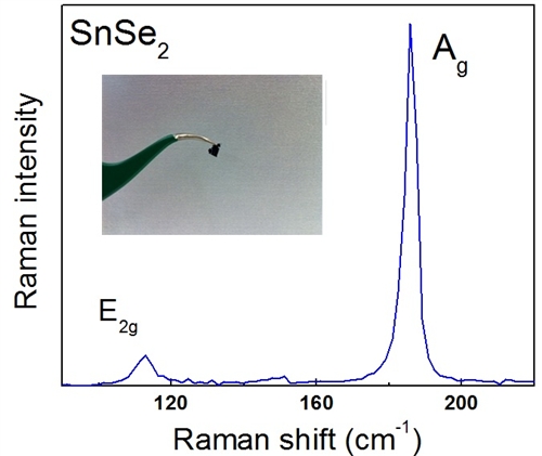 World record size single crystal SnSe₂ (Tin diselenide) crystals are developed at our facilities using state-of-art techniques. All the crystals are ready to exfoliate as shown in the images. Crystals are larger than 1cm in size giving you plenty of material to work with. In the bulk form SnSe₂ is 1.0 eV direct band gap semiconductor and becomes 1.4 eV direct semiconductor in the monolayer form. Displays remarkable and unusual optical, mechanical, and electrical properties that are waiting to the published in the literature. Yet, monolayer SnSe₂ remains unknown by the scientific community and waiting to be discovered. Crystals are highly crystalline with very sharp Raman peak signal at 109 and 182 cm-1 with FWHM less than 4cm-1. They are developed at our facilities using state-of-art flux zone techniques. Each growth takes close to three months to provide you perfected crystals that does not contain any halides. In contrast to commonly used chemical vapor transport (CVT) technique, flux grown crystals are well known for their structural perfection and electronic/optical performance. Each crystal very large in size to last for years, is highly crystalline, oriented in 0001 direction, and easy to exfoliate. Our R&D staff takes characterization dataset in each sample piece to ensure structural, optical, and electronic consistency.