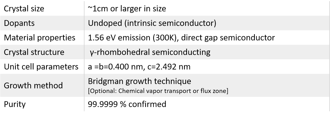 InSe (indium selenide) is the first commercially available InSe layered materials in the field. Our single crystal InSe crystals come with guaranteed optical, electronic, and structural anisotropy. They are developed at our facilities using three different state-of-art techniques: i) Bridgman growth, ii) flux zone growth, and iii) chemical vapor transport (CVT) growth. The latter (CVT) produces contaminated samples. Flux zone technique is suitable for good crystallization but crystal sizes are limited to ~5mm. In contrast, Brigmann method offers good crystallinity as well as large size (larger than 1cm). Each crystal is highly crystalline, oriented in 0001 direction, and easy to exfoliate. Our R&D staff takes characterization dataset in each sample piece to ensure structural, optical, and electronic consistency.