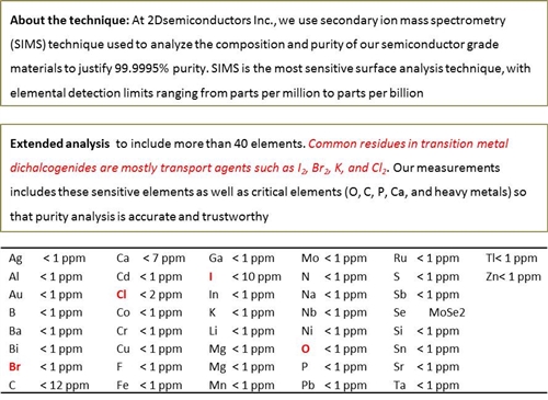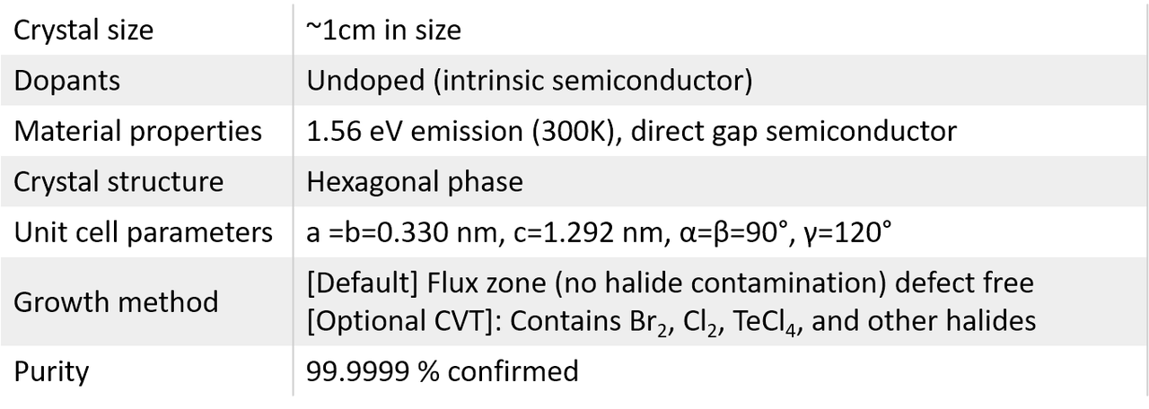 Growth method matters> Flux zone or CVT growth method? Contamination of halides and point defects in layered crystals are well known cause for their reduced electronic mobility, reduced anisotropic response, poor e-h recombination, low-PL emission, and lower optical absorption. Flux zone technique is a halide free technique used for synthesizing truly semiconductor grade vdW crystals. This method distinguishes itself from chemical vapor transport (CVT) technique in the following regard: CVT is a quick (~2 weeks) growth method but exhibits poor crystalline quality and the defect concentration reaches to 1E11 to 1E12 cm-2 range. In contrast, flux method takes long (~3 months) growth time, but ensures slow crystallization for perfect atomic structuring, and impurity free crystal growth with defect concentration as low as 1E9 - 1E10 cm-2. During check out just state which type of growth process is preferred. Unless otherwise stated, 2Dsemiconductors ships Flux zone crystals as a default choice.