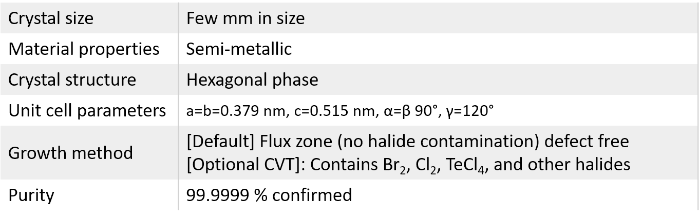 Growth method matters> Flux zone or CVT growth method? Contamination of halides and point defects in layered crystals are well known cause for their reduced electronic mobility, poor e-h recombination, low-PL emission, and lower optical absorption. Flux zone technique is a halide free technique used for synthesizing truly semiconductor grade vdW crystals. This method distinguishes itself from chemical vapor transport (CVT) technique in the following regard: CVT is a quick (~2 weeks) growth method but exhibits poor crystalline quality and the defect concentration reaches to 1E11 to 1E12 cm-2 range. In contrast, flux method takes long (~3 months) growth time, but ensures slow crystallization for perfect atomic structuring, and impurity free crystal growth with defect concentration as low as 1E9 - 1E10 cm-2. So if your research needs truly high quality crystals for optoelectronics, scanning tunneling microscopy, spectroscopy, and other projects that rely on defect free crystals, flux zone growth is ideal for you. However, if you need catalytic materials presence of defects typically helps and in such case CVT method is better suited. During check out just state which type of growth process is preferred. Unless otherwise stated, 2Dsemiconductors ships Flux zone crystals as a default choice.